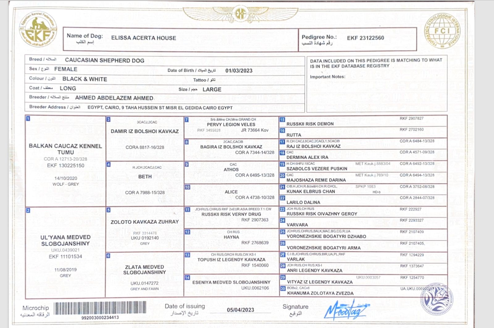 - Microchip number: 992003000234413